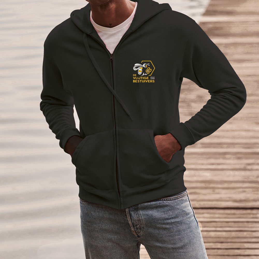 Hoodie met rits. Gevoerde capuchon met jersey nektape. Platte aanrijgkoordjes in dezelfde kleur. 2 ‘kangaroe’ voorzakken.